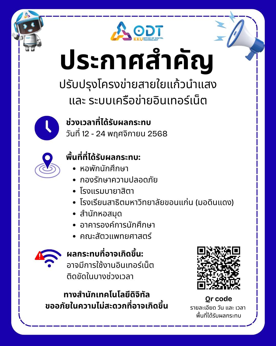 ประกาศ ปิดปรับปรุงโครงข่ายสายใยแก้วนำแสงและระบบเครื่องข่ายอินเทอร์เน็ต