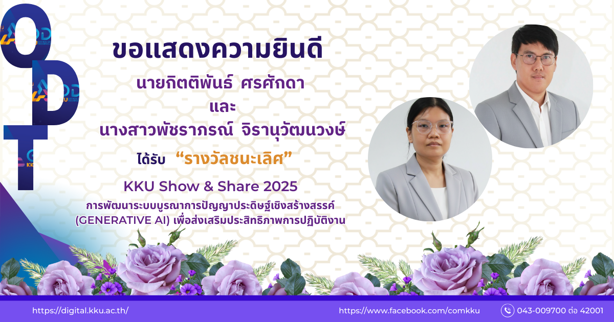 ผู้บริหารและบุคลากรสำนักเทคโนโลยีดิจิทัล ร่วมแสดงความยินดีกับบุคลากรที่คว้ารางวัลรางวัลชนะเลิศ การพัฒนาระบบบูรณาการบริการปัญญาประดิษฐ์เชิงสร้างสรรค์ (Generative AI) เพื่อส่งเสริมประสิทธิภาพการปฎิบัติงาน สำนักเทคโนโลยีดิจิทัล นายกิตติพันธ์ ศรศักดิ์ และนางสาวพัชราภรณ์ จิราณุวัฒนวงษ์ โครงการ Show & Share 2025 AI IN ACTION เปลี่ยนวิธีคิด พลิกวิธีทำ ยกระดับองค์กร เมื่อวันศุกร์ที่ 12 ธันวาคม 2568 ณ ห้องประชุมสิริคุณากร 3 ความสำเร็จครั้งนี้เป็นการยืนยันศักยภาพของสำนักเทคโนโลยีดิจิทัลในการพัฒนานวัตกรรมคุณภาพสูงและเสริมสร้างชื่อเสียงของมหาวิทยาลัย